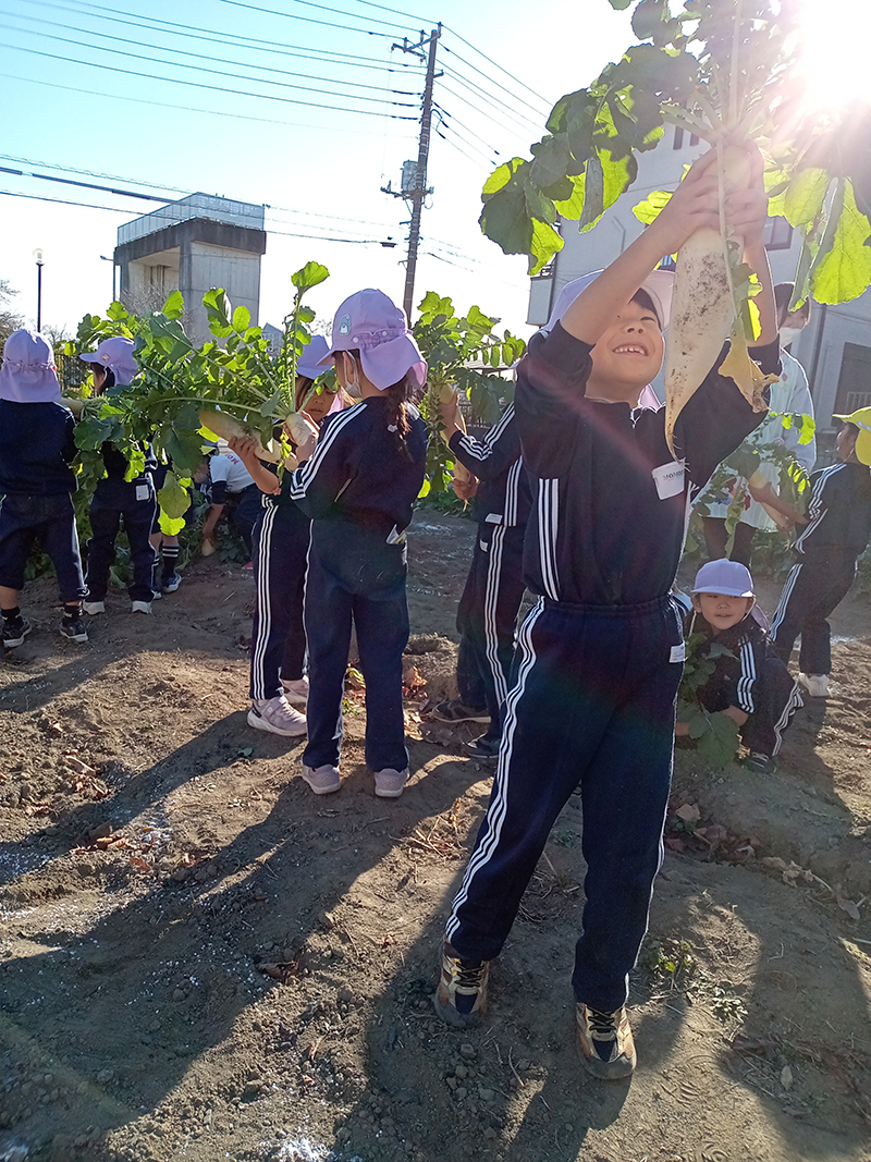 立派な大根を見せ合いながら、「大きいね!!」「重いね!!」と友達同士お話をする姿がありました。